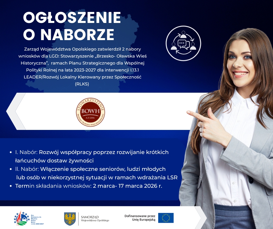Zarząd Województwa Opolskiego w dniu 10 lutego 2026 r. zatwierdził nabory wniosków o przyznanie pomocy ramach Planu Strategicznego dla Wspólnej Polityki Rolnej na lata 2023-2027 dla interwencji I.13.1 LEADER/Rozwój Lokalny Kierowany przez Społeczność (RLKS) – komponent Wdrażanie LSR, realizowany przez Stowarzyszenie Brzesko-Oławska Wieś Historyczna z zakresu rozwój współpracy poprzez rozwijanie krótkich łańcuchów dostaw żywności.