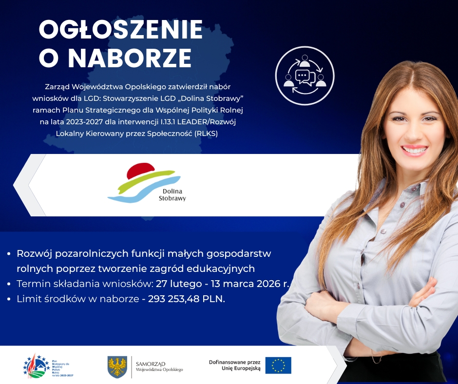 Zarząd Województwa Opolskiego w dniu 10 lutego 2026 r. zatwierdził nabór wniosków o przyznanie pomocy ramach Planu Strategicznego dla Wspólnej Polityki Rolnej na lata 2023-2027 dla interwencji I.13.1 LEADER/Rozwój Lokalny Kierowany przez Społeczność (RLKS) – komponent Wdrażanie LSR, realizowany przez Stowarzyszenie Lokalna Grupa Działania „Dolina Stobrawy” z zakresu: Rozwój pozarolniczych funkcji małych gospodarstw rolnych poprzez tworzenie zagród edukacyjnych (start ZE).